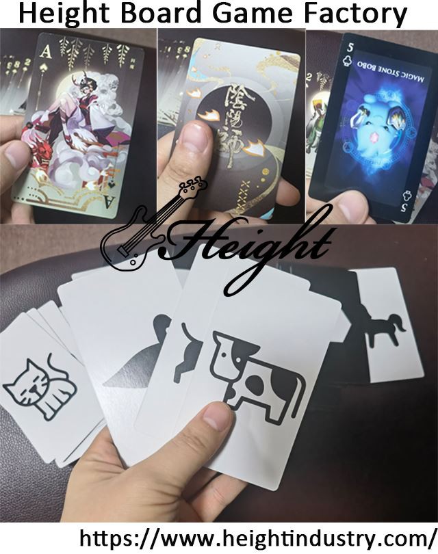 br. modela:HTBX01 Ime proizvoda:Ispis papira za društvene igre po mjeri profesionalnih dizajnera Prilagođeno:Logo i OEM prihvaćeni. Materijal:250g, 270g sivo jezgro;280g plavo jezgro;285g,290g, 300g, 330g crno jezgro papir za igraće karte; 300g, 350g, 400g umjetnički papir; 0,31 novi PVC itd. veličina:57*87mm, 62*87mm, 63*88mm,67*97mm,40*58mm,70*110mm,62*95mmmor prilagođeno Boja:4 plus 4C Vezivanje:sedlasto šivanje Štampanje:Digitalna štampa, ofset štampa StavkaKlijentDizajner:Strange Game As |